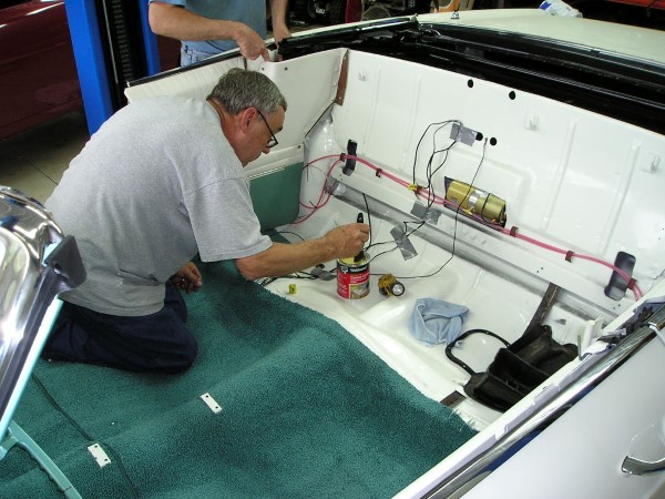 Once we got the Impala home, we gave it a power wash bath to clean it up. Norm got the bright idea and asked, why don’t we throw a battery in the car and see if it starts. I thought he was nuts.but I went into the garage and retrieved a battery and installed it in the Impala. The first thing I did was turn the engine over with a breaker bar on the harmonic balancer to make sure the engine was not locked up. I was amazed that the engine did in fact turn over. Norm turned the key and the engine started to crank over. I was stunned. So was everyone else. I grabbed my dwell meter and set the points. What we found was no fire from the engine coil. So, I grabbed another coil, stuck it in and after about three of four revolutions, the engine lit off.